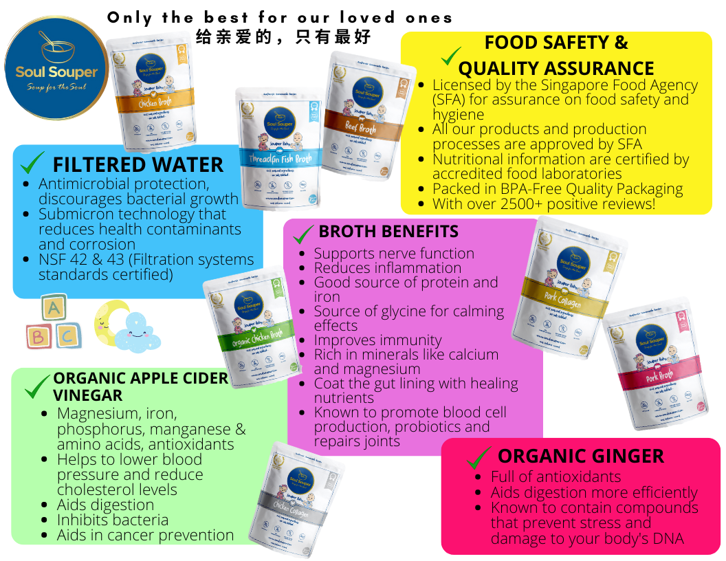 Soul Souper bone broths are made using only 100% natural & premium ingredients without any sugar, preservatives, additives, artificial flavouring or MSG and are crafted from carefully planned recipes with the single aim of providing the best quality bone broths without compromising on the taste. Also comes in sizes of 100ml BPA free packs for convenience of preparing small meals for babies & toddlers too!
